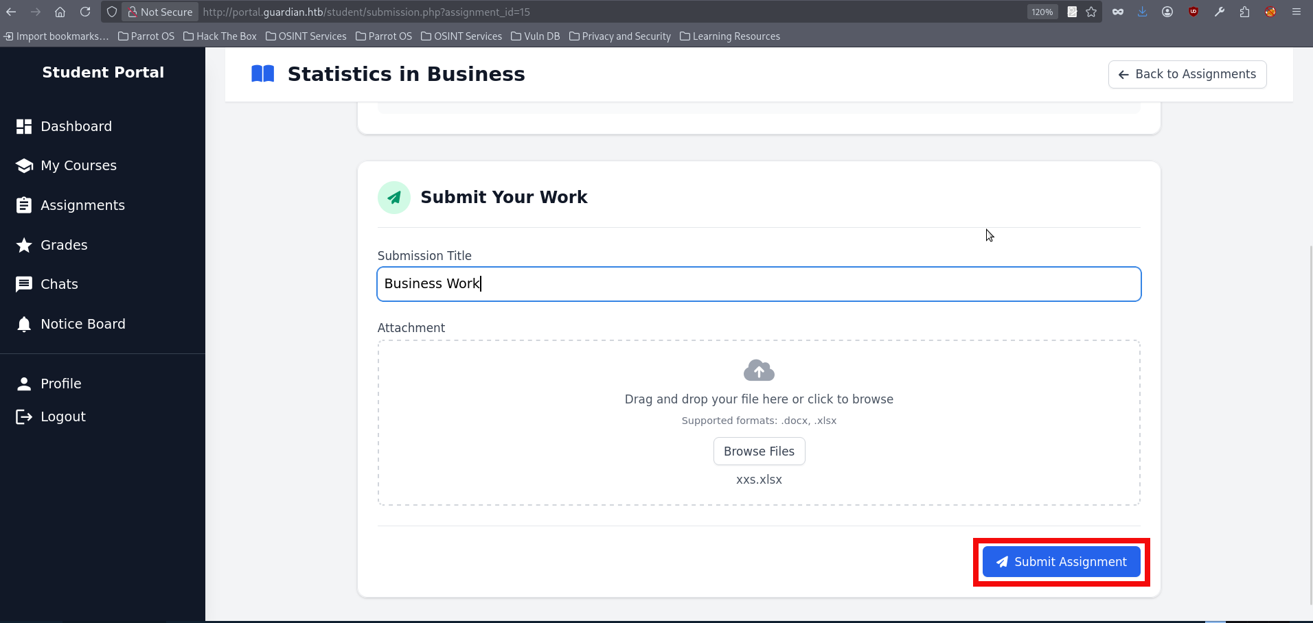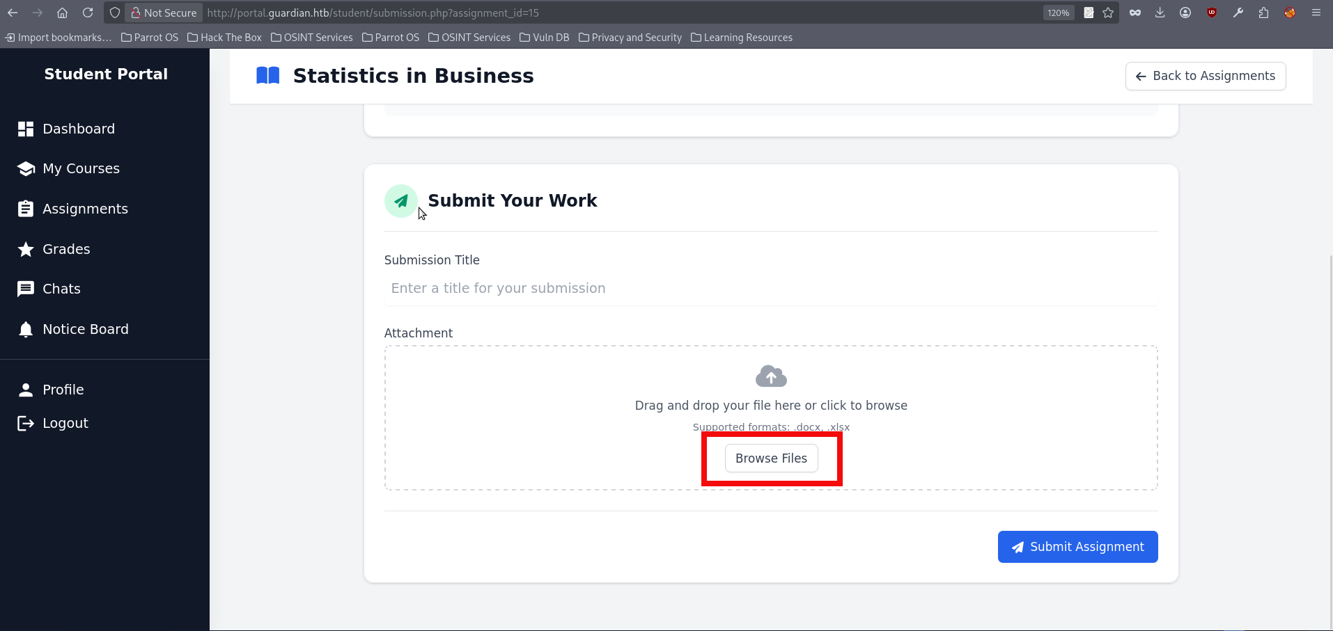 - We gained initial access to the portal, but our account doesn’t have any special privileges. Still, we can explore the available functionality. For example we can upload .doc and .xlxs file here, but it doesn’t seem to lead anywhere yet. We can view assignments and check our grades, but it doesn’t seem to be useful as well. After some investigation, we notice chat.php, which contains data from users’ chats:
