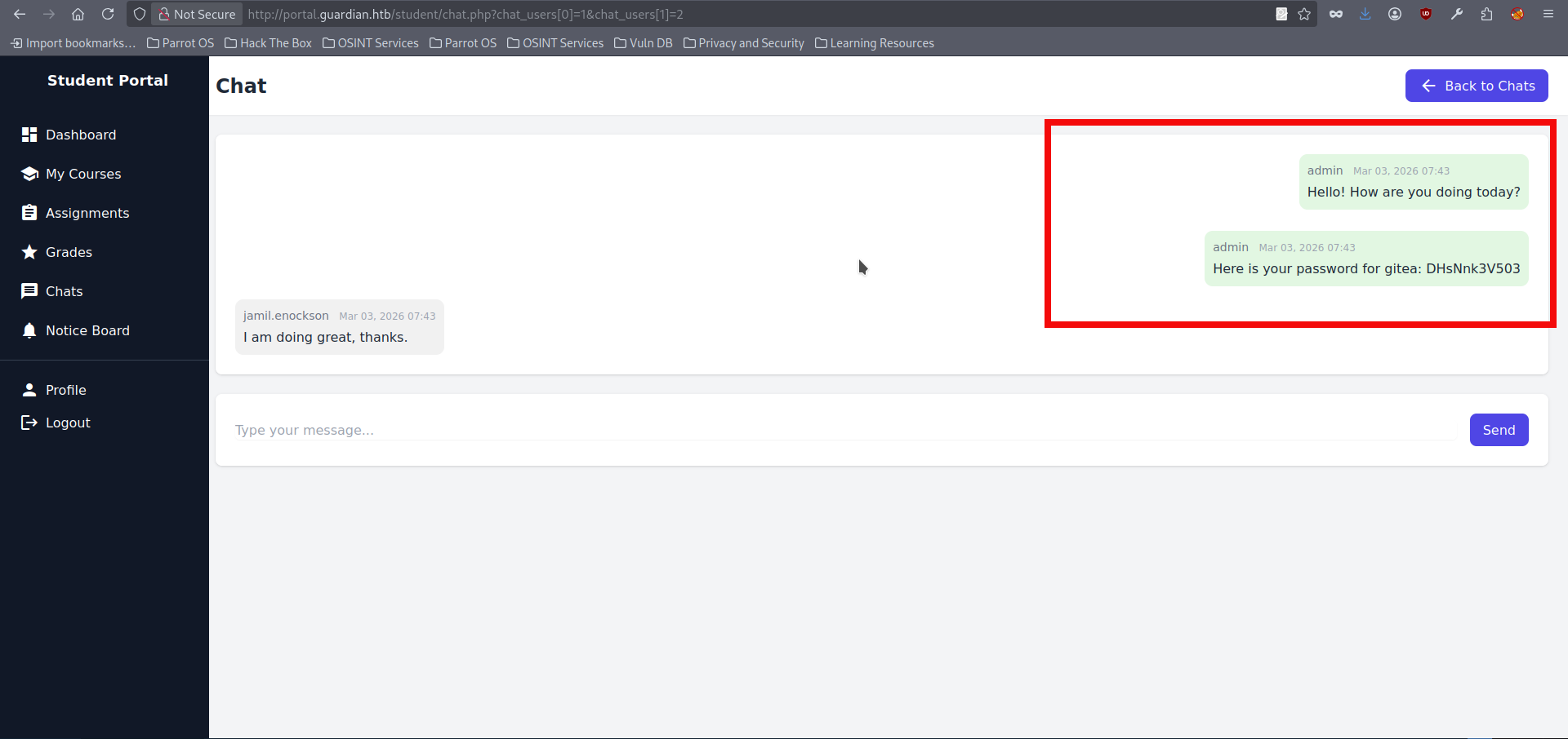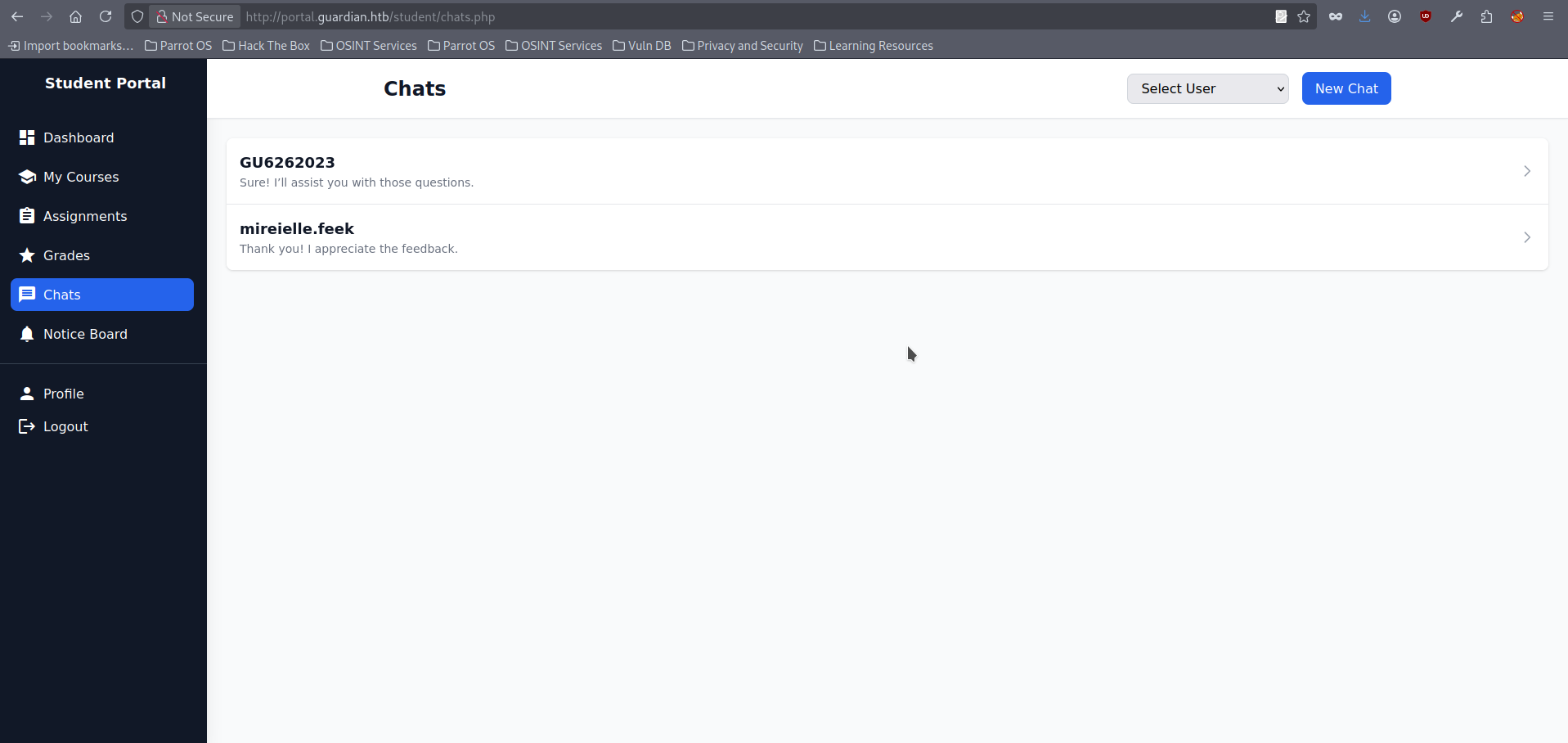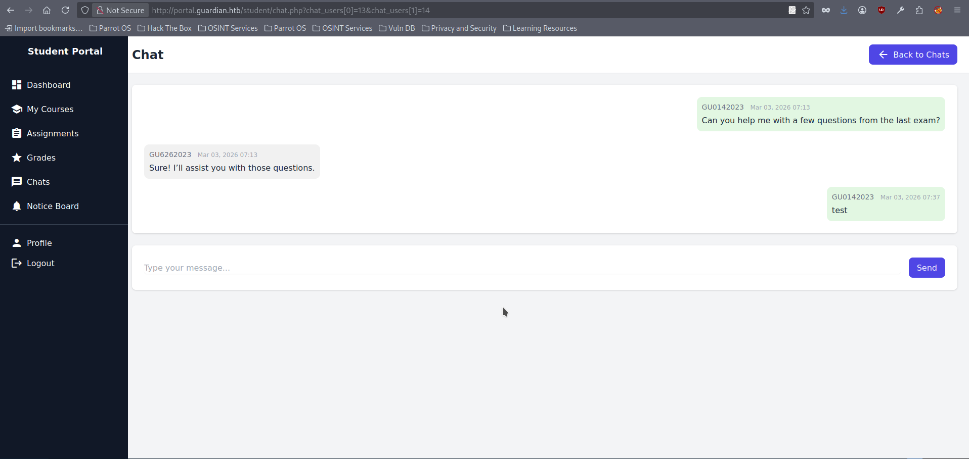- If we open any chat, we notice the URL follows this format: http://portal.guardian.htb/student/chat.php?chat_users[0]=x&chat_users[1]=y where: