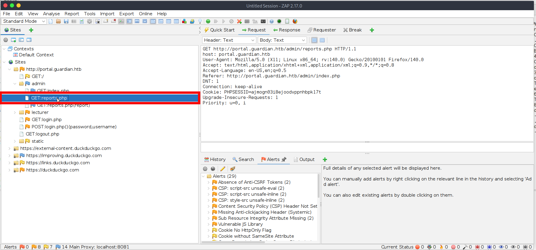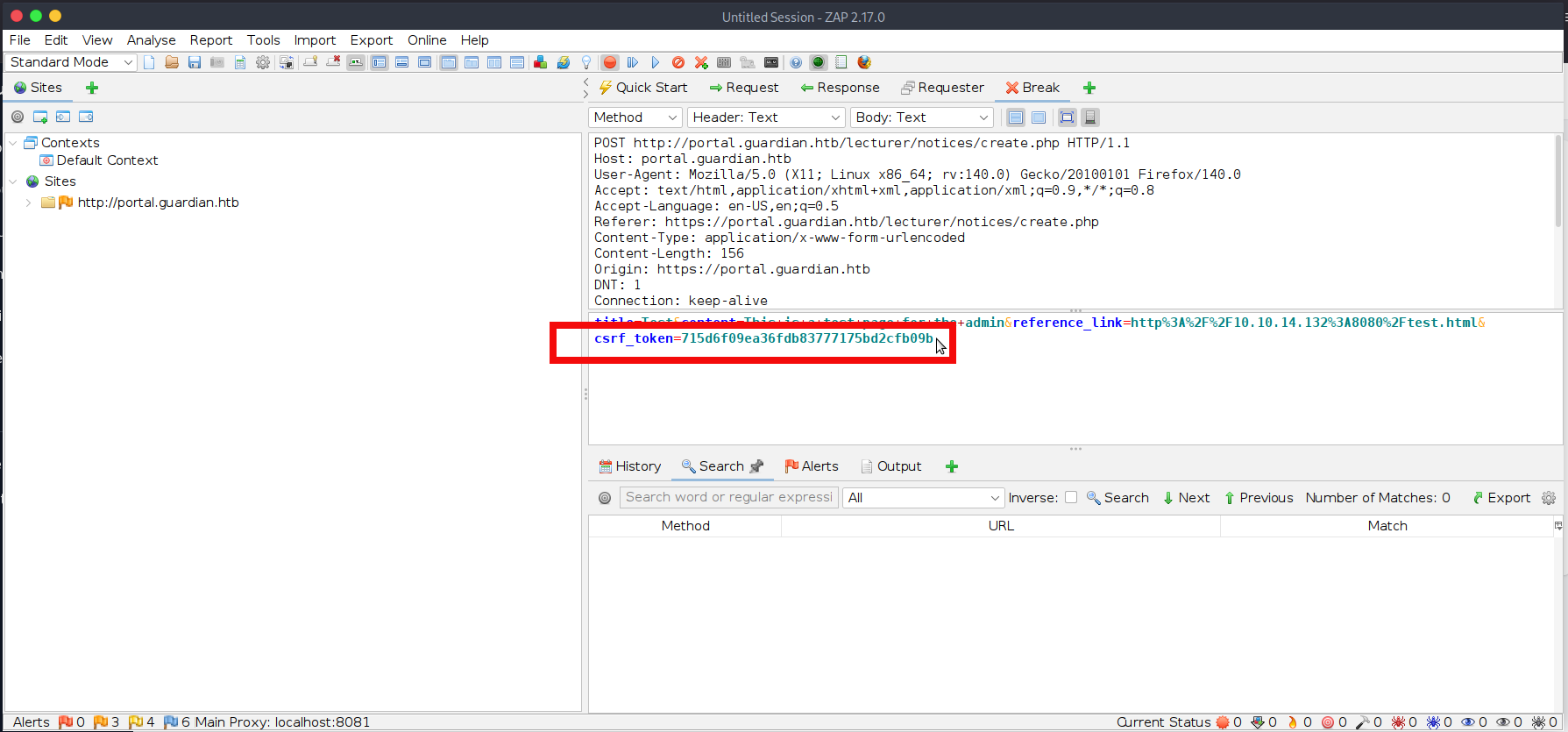 - We need to obtain a valid CSRF token now. Looking through the website source code again reveals that a CSRF token is also generated in create.php, the file used by the notice creation functionality available to the lecturer. This means we can simply retrieve a valid token from there and place it into the csrf_token field in our crafted page. We have several options for intercepting the CSFR Token, but for this initial run we will use ZAP Proxy. A full explanation of how to work with ZAP Proxy is outside the scope of this writeup, so only the essential steps are covered here. Launch the application, open the integrated browser, and then repeat the actions from step 26 to establish a lecturer session. Keep in mind that the box periodically runs cleanup scripts, so cookie values may expire. If that happens, you may need to repeat the file upload and cookie theft process as well.