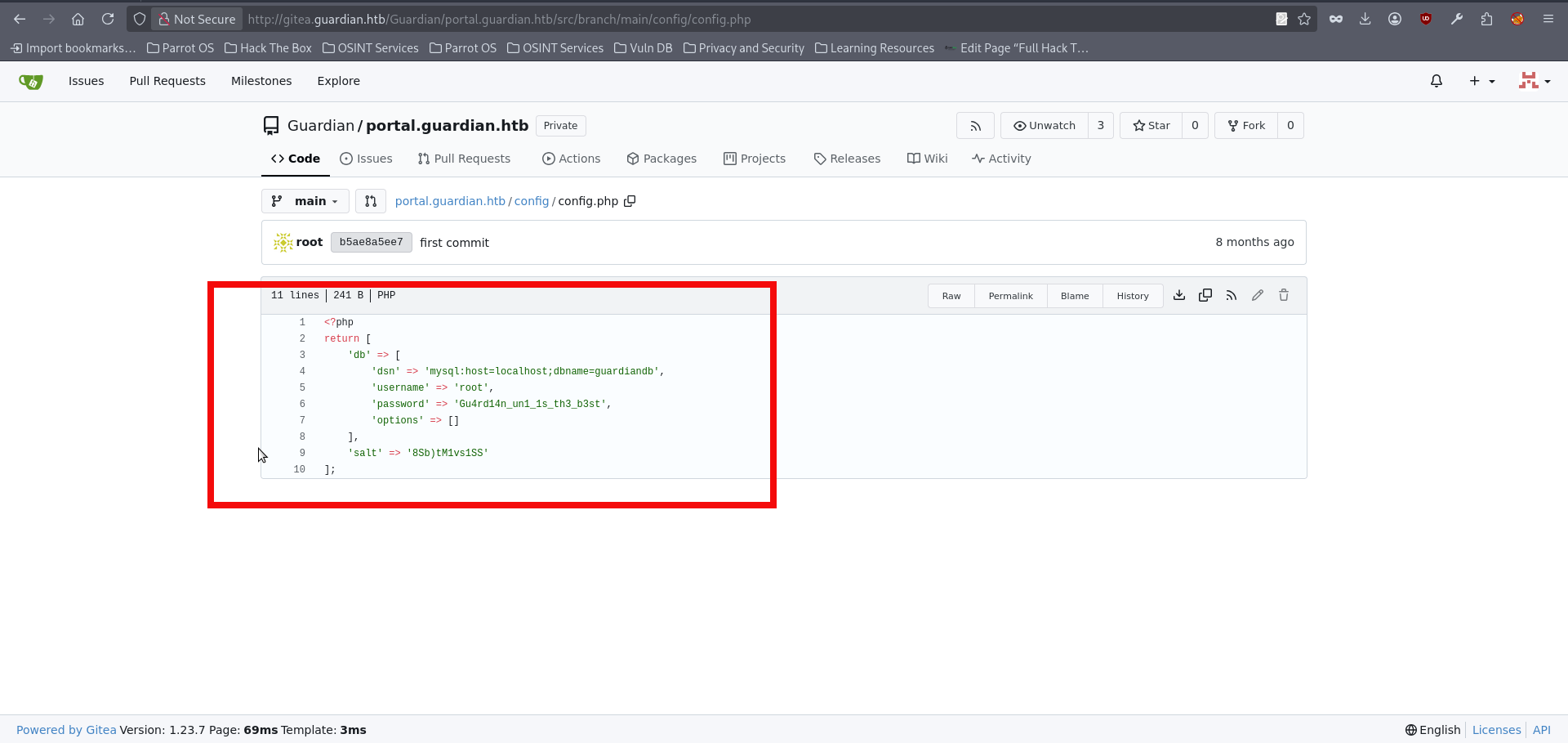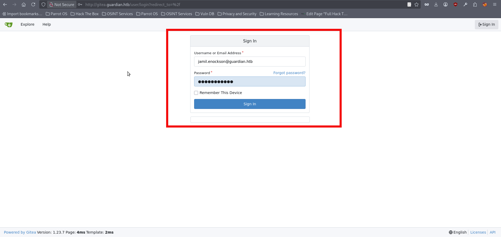 - If we visit gitea.guardian.htb we can see that the subdomain exists, and we can try logging in using the credentials we obtained earlier, however we strictly need to use email address (jamil.enockson@guardian.htb) in the login form: