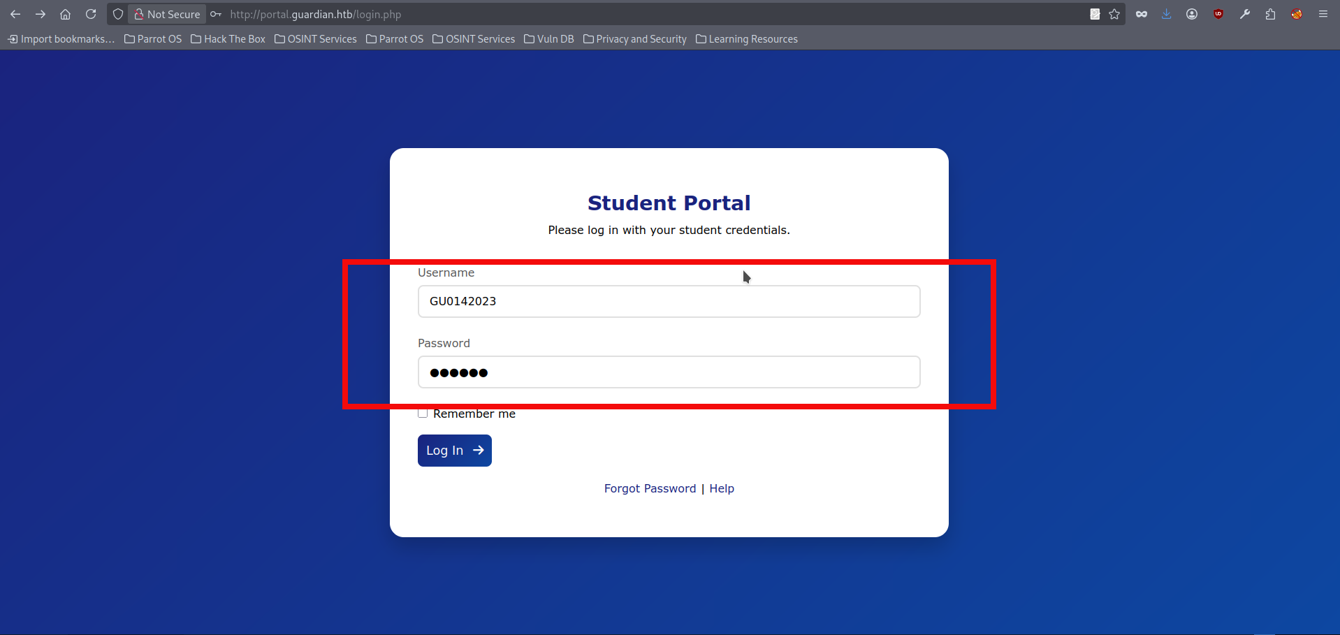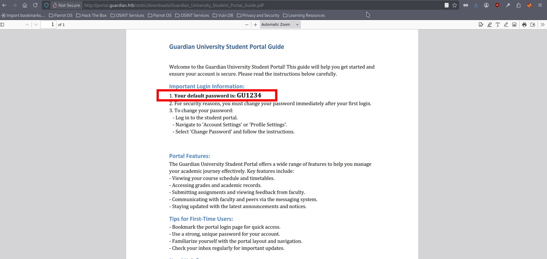 - If we try these emails on the portal.guardian.htb login page, one of them (GU0142023) unexpectedly works: