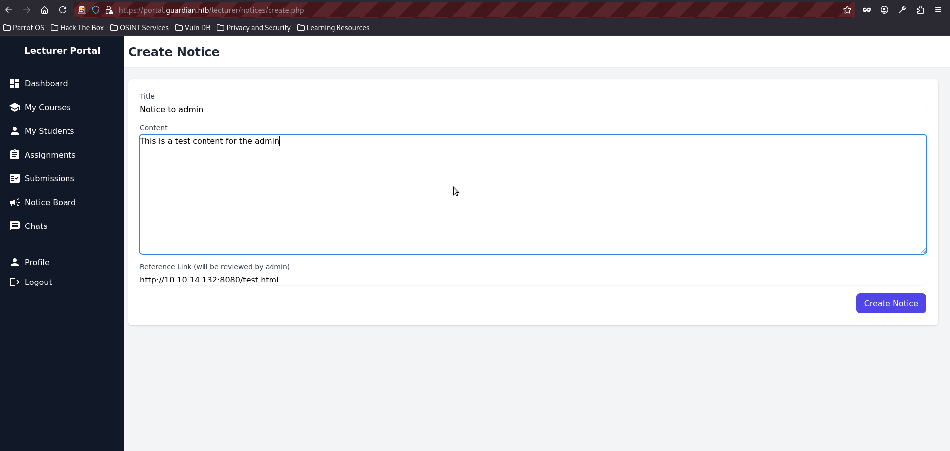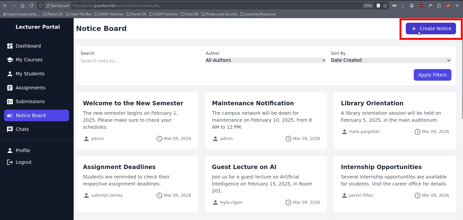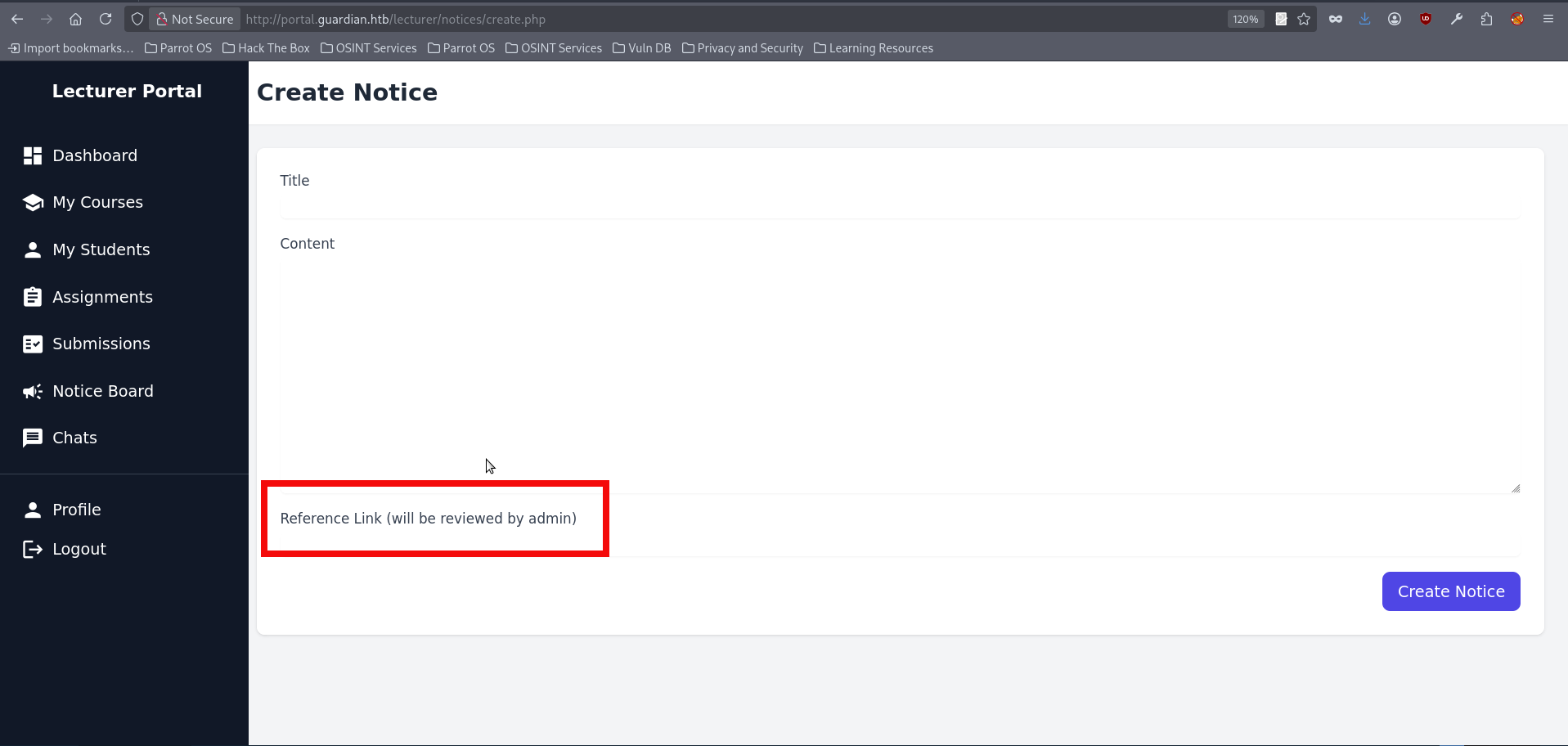 - We are now logged in as the lecturer and have access to additional functionality within the portal. One of the newly available features allows us to create Notices, which are later reviewed by the admin. This stands out as an attractive target, since it gives us another opportunity to repeat the same XSS technique as before: