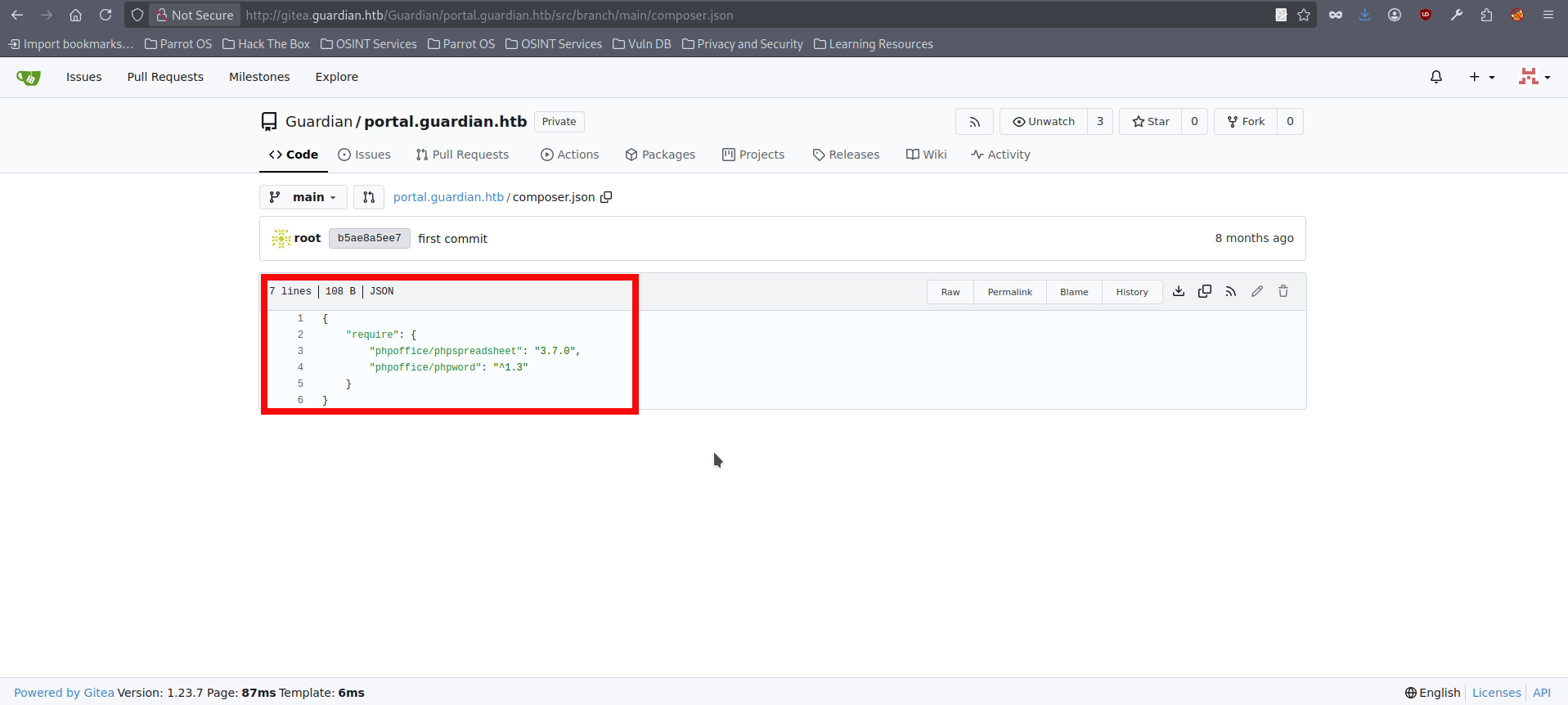 - We successfully log in and immediately see links to a couple of repositories. Our focus should be on the Guardian portal repository, since it contains many source code files we can inspect. I personally got stuck at this point for quite a while. For example, repo contains db credentials here but they are not useful at this time. The repository also includes admin and lecturer folders, which likely map to additional functionality and privileged endpoints. However, at the moment we only have regular user access, and the general user-facing features don’t seem to expose any obvious vulnerabilities. After a while, we can see in composer.json that the web application relies on third-party packages for documents, specifically PhpSpreadsheet (version 3.7.0):